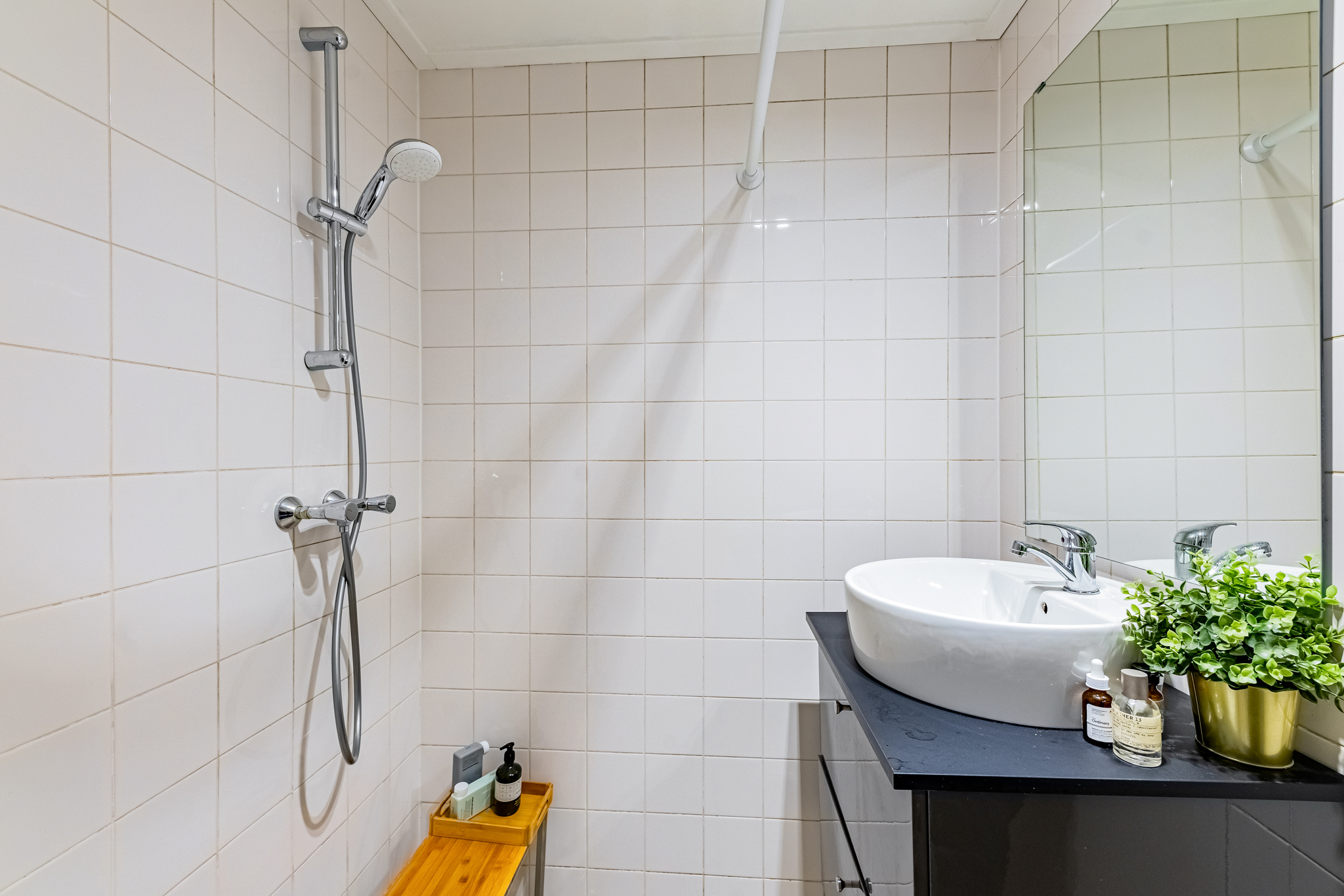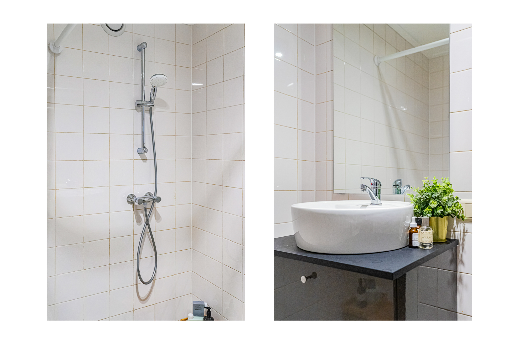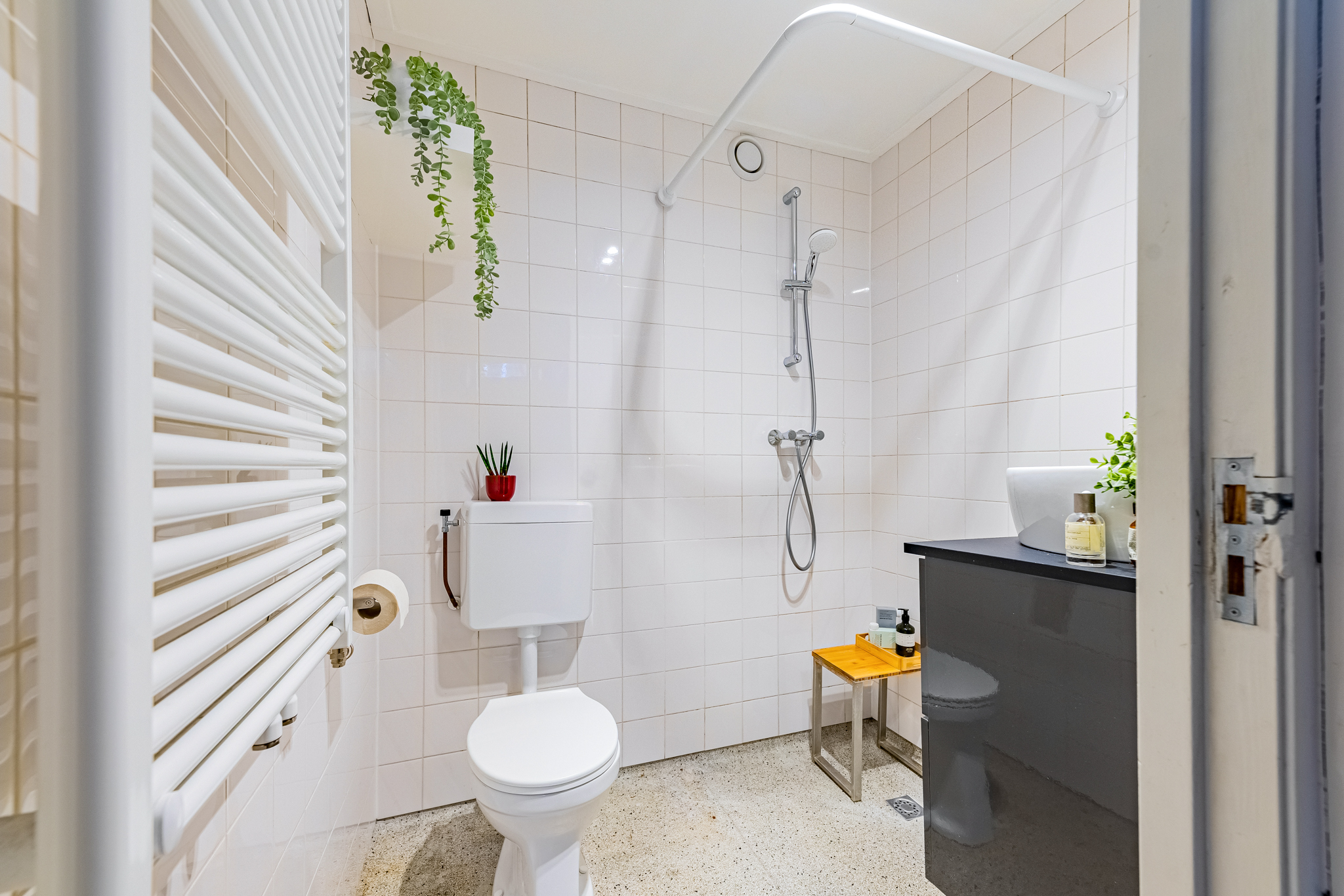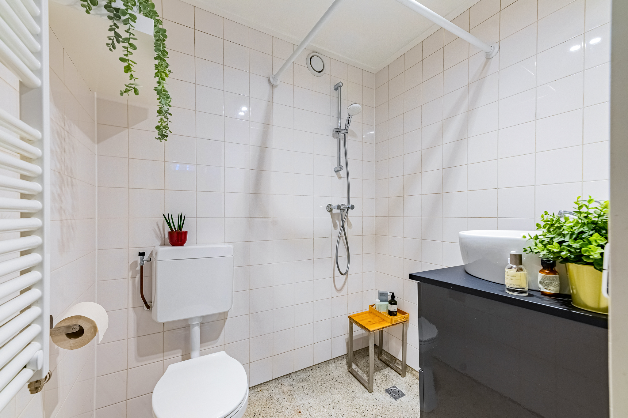 Naar de bergkast vindt u de badkamer, deze is voorzien van inloopdouche, wc en wastafel en tot het plafond betegeld. (foto’s zien)
