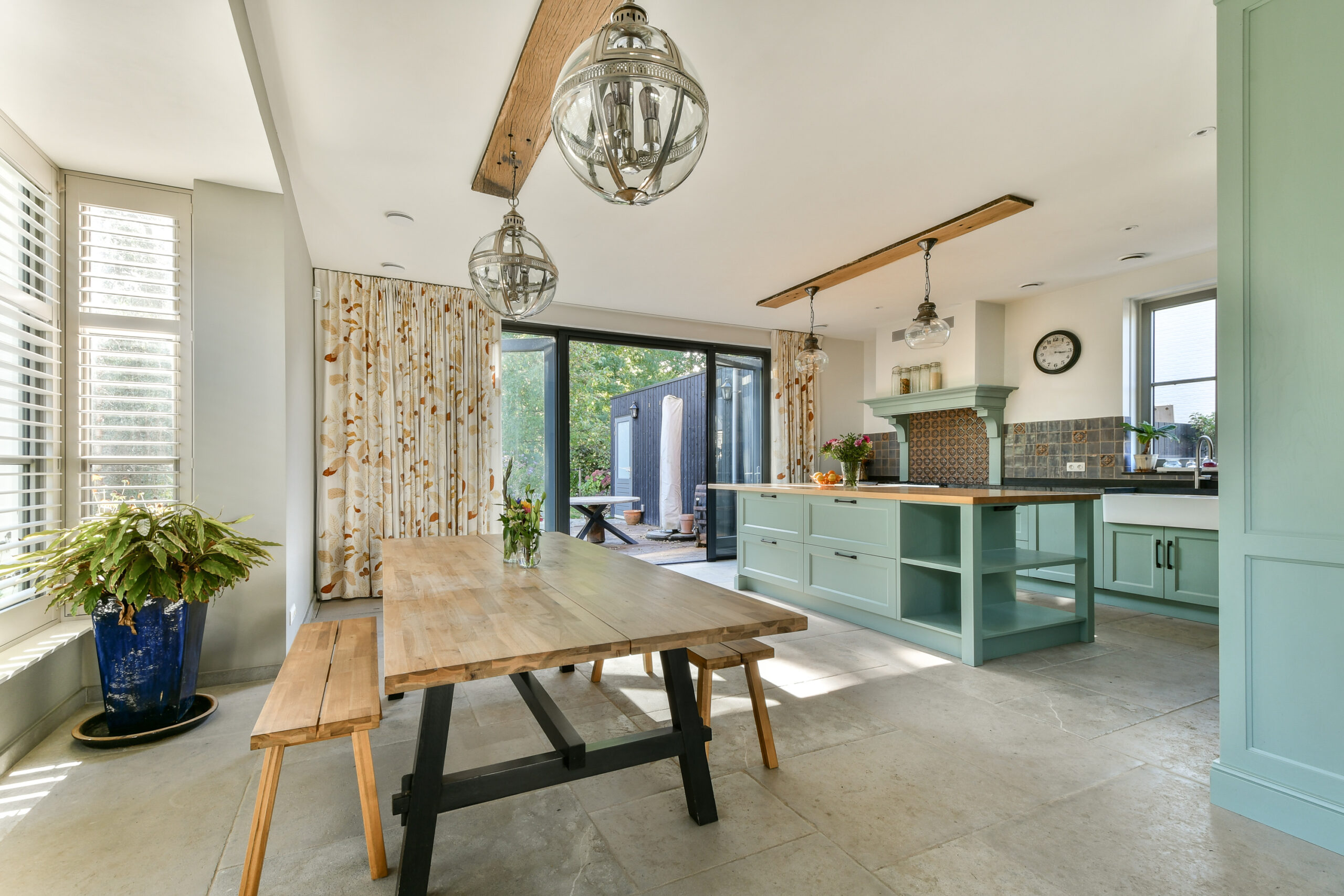 Uitgebouwde woonkeuken met een zeer royale op maat gemaakte keuken in hoekopstelling met middenblok en Belgisch hardstenen blad. De landelijke keuken is voorzien van diverse inbouwapparatuur waaronder een groot fornuis, Smeg elektrische oven, een Quooker kraan, dubbele wastafel, Amerikaanse koelkast en vaatwasser.