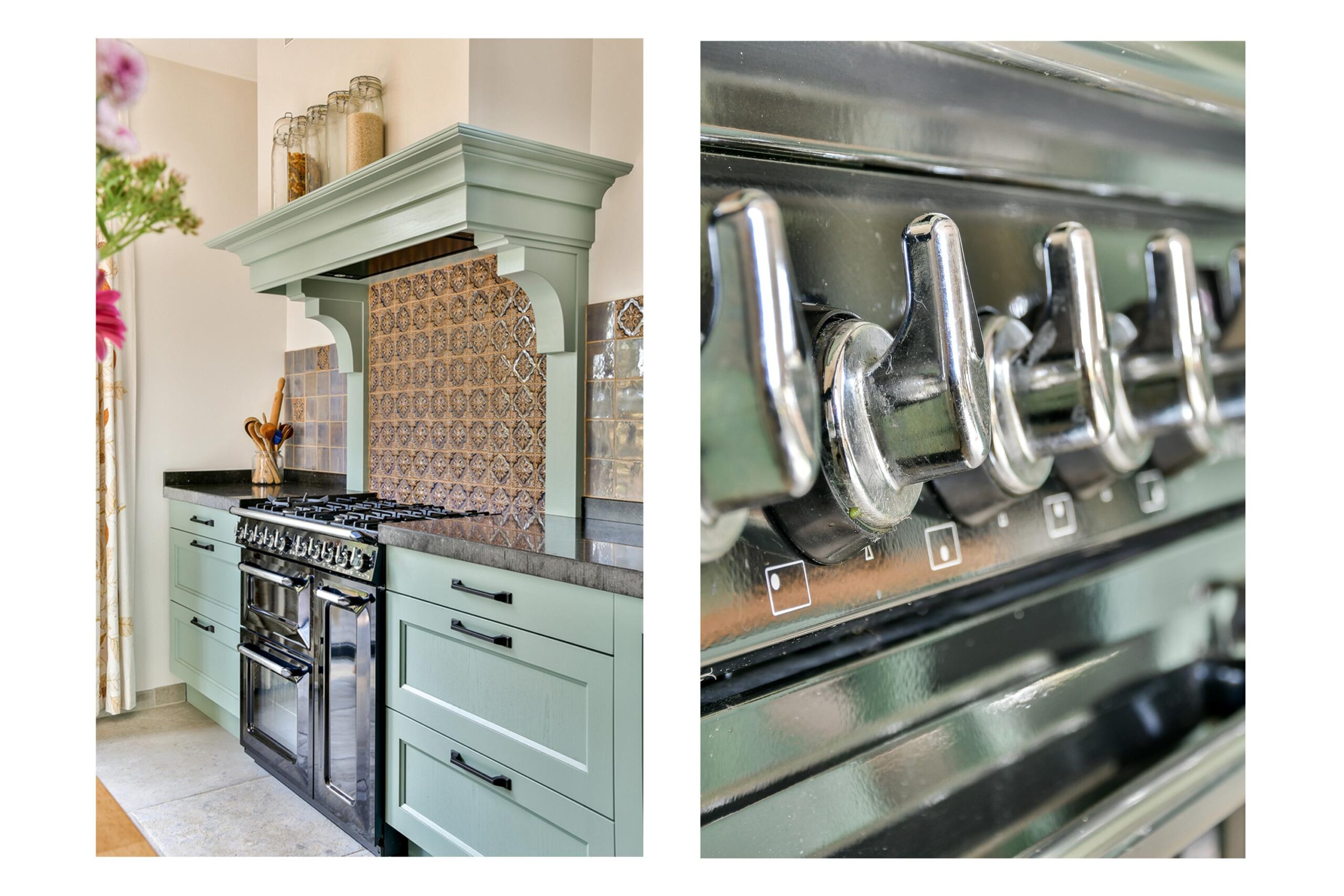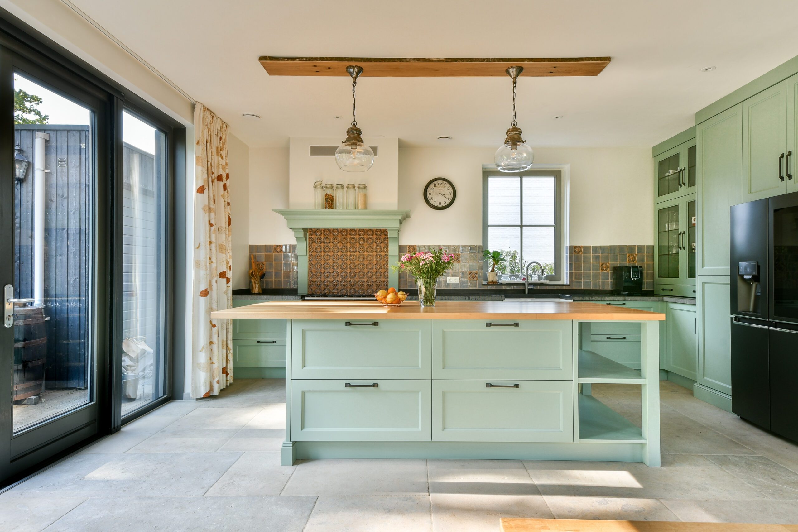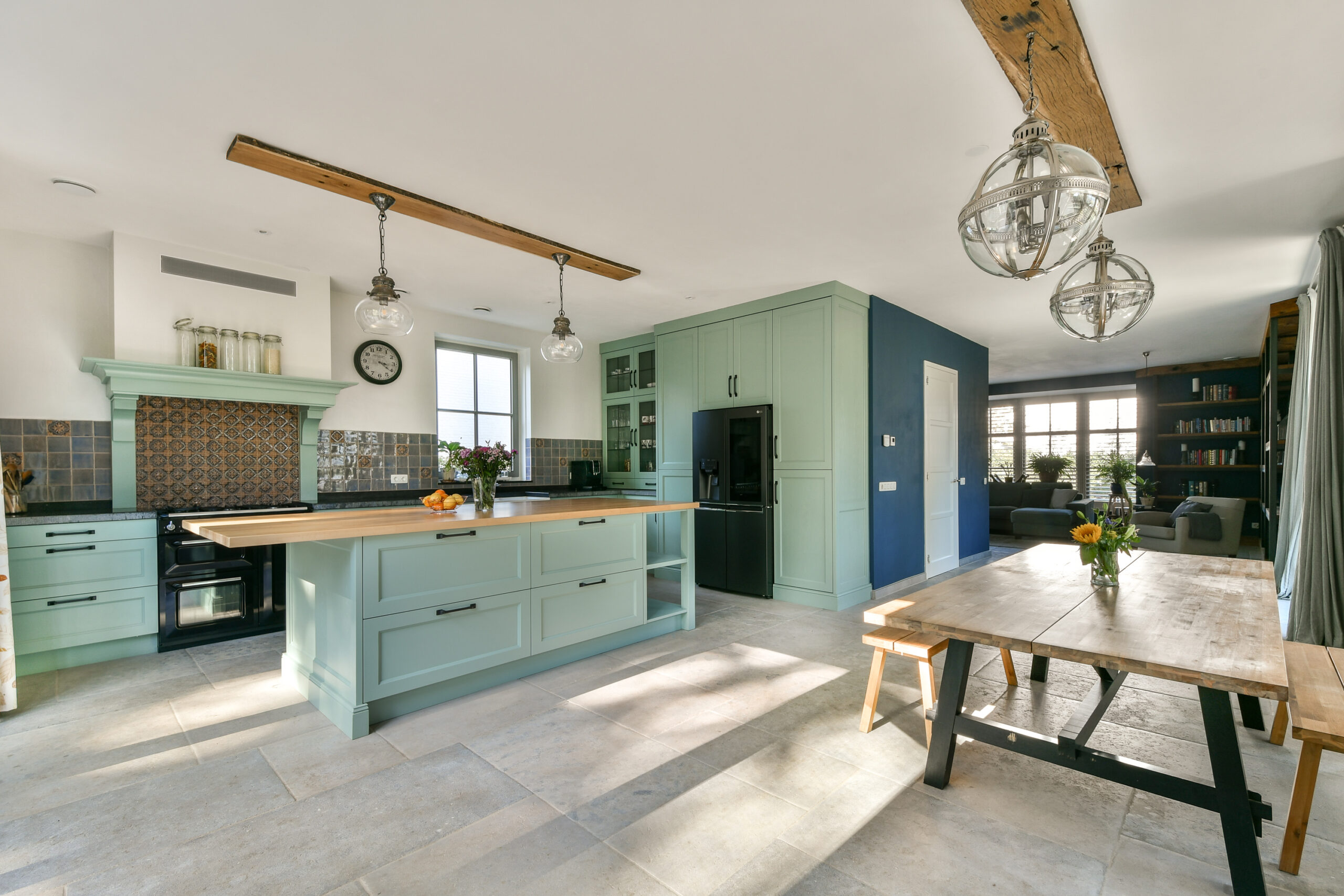 Uitgebouwde woonkeuken met een zeer royale op maat gemaakte keuken in hoekopstelling met middenblok en Belgisch hardstenen blad. De landelijke keuken is voorzien van diverse inbouwapparatuur waaronder een groot fornuis, Smeg elektrische oven, een Quooker kraan, dubbele wastafel, Amerikaanse koelkast en vaatwasser.