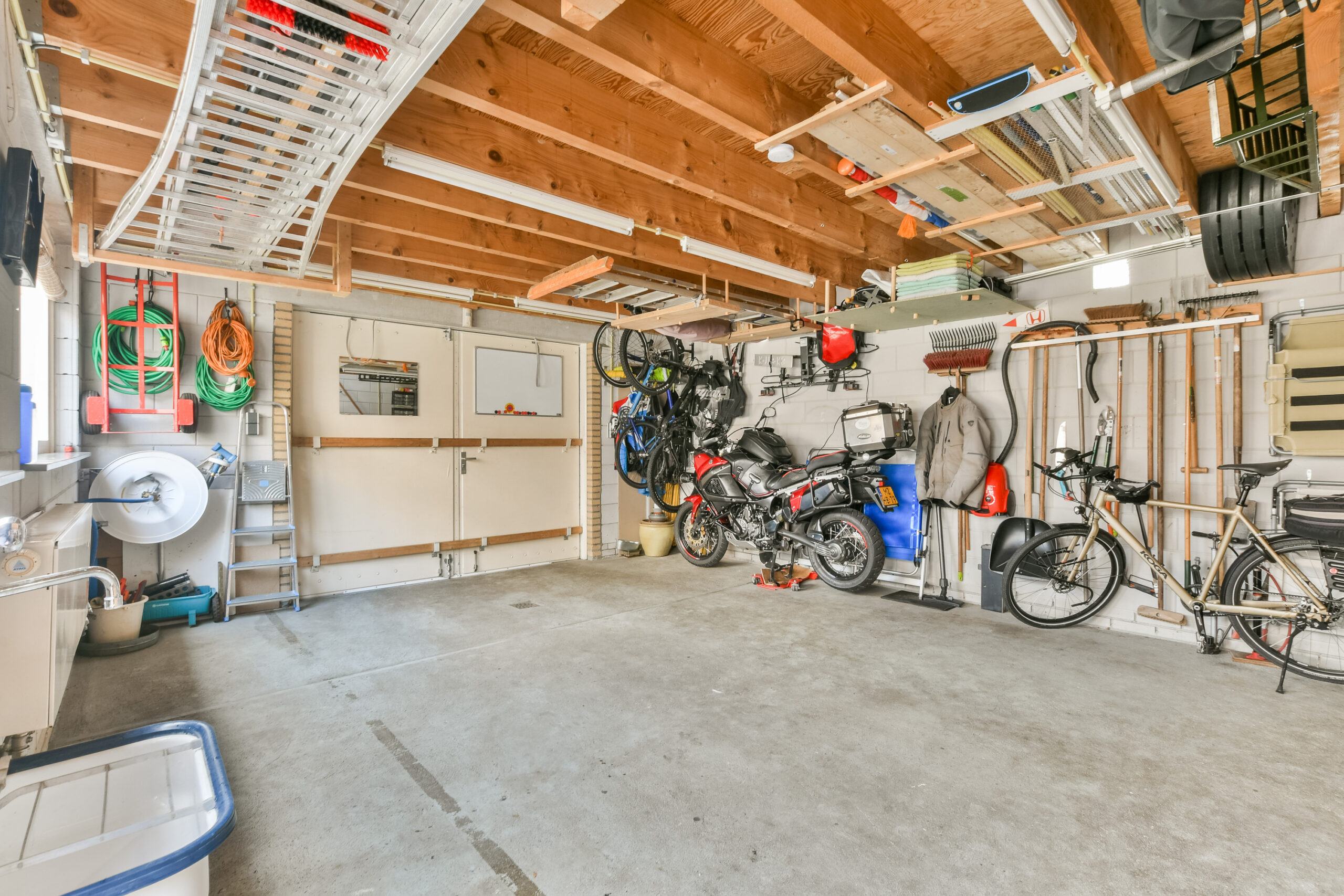 De royale garage is volledig geïsoleerd (muren, dak, vloer) en heeft gelaagd dubbelglas voor extra veiligheid. Er is een uitstortgootsteen met koud water en aangesloten op het riool, een professionele, krachtige slanghaspel en een verwarmingsradiator. De openslaande garagedeuren leiden naar de oprit met sierhek, aansluitend op de rustige zijstraat. Een vaste trap leidt naar de verdieping; wederom heel veel licht en ruimte. Op het garage dak liggen 10 zonnepanelen, goed voor 4,2 KWp.